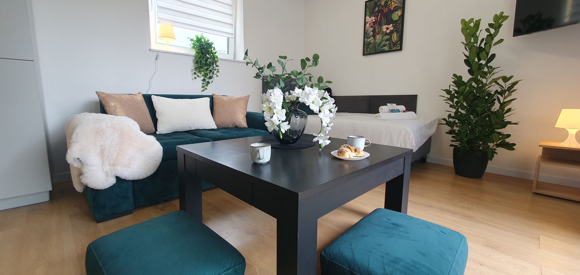 Apartament czteroosobowy z salonem i balkonem.