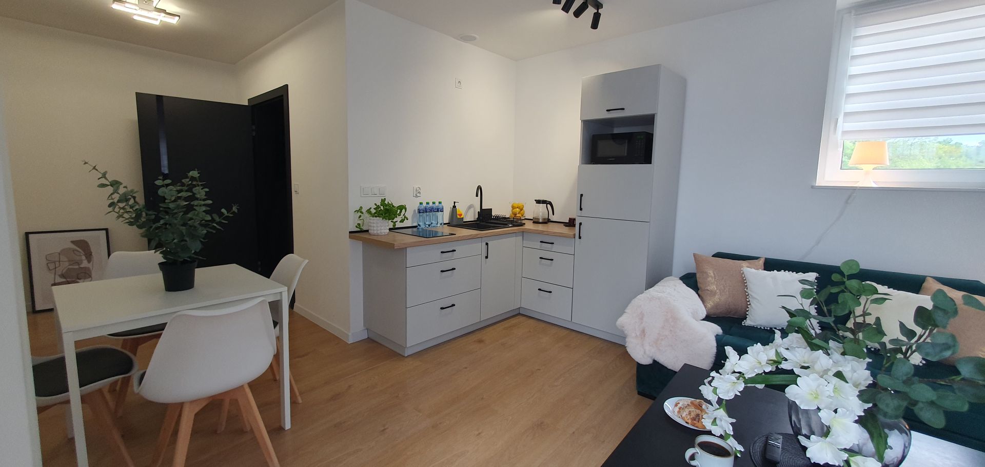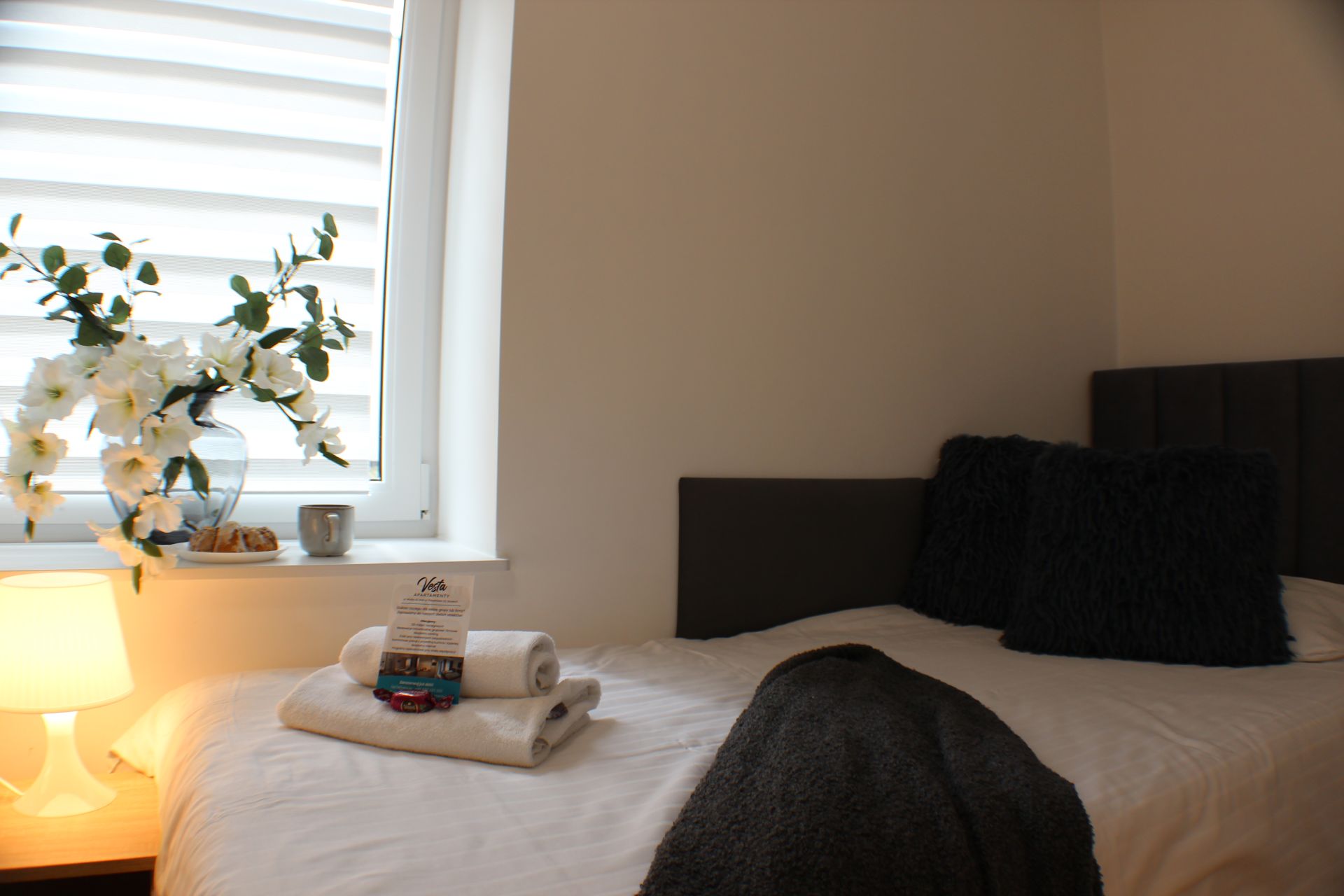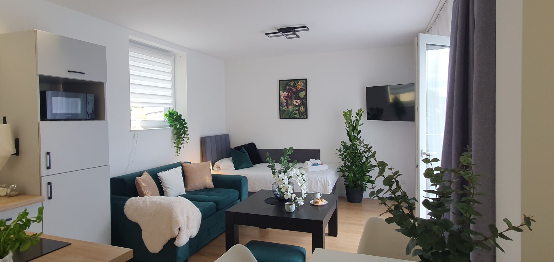 Apartament składa się z salonu z aneksem kuchennym, z którego prowadzi wyjście na balkon, wyposażonego w jedno łóżko pojedyncze i telewizor, oraz oddzielnej sypialni z trzema łóżkami pojedynczymi. Do dyspozycji Gości jest prywatna łazienka.