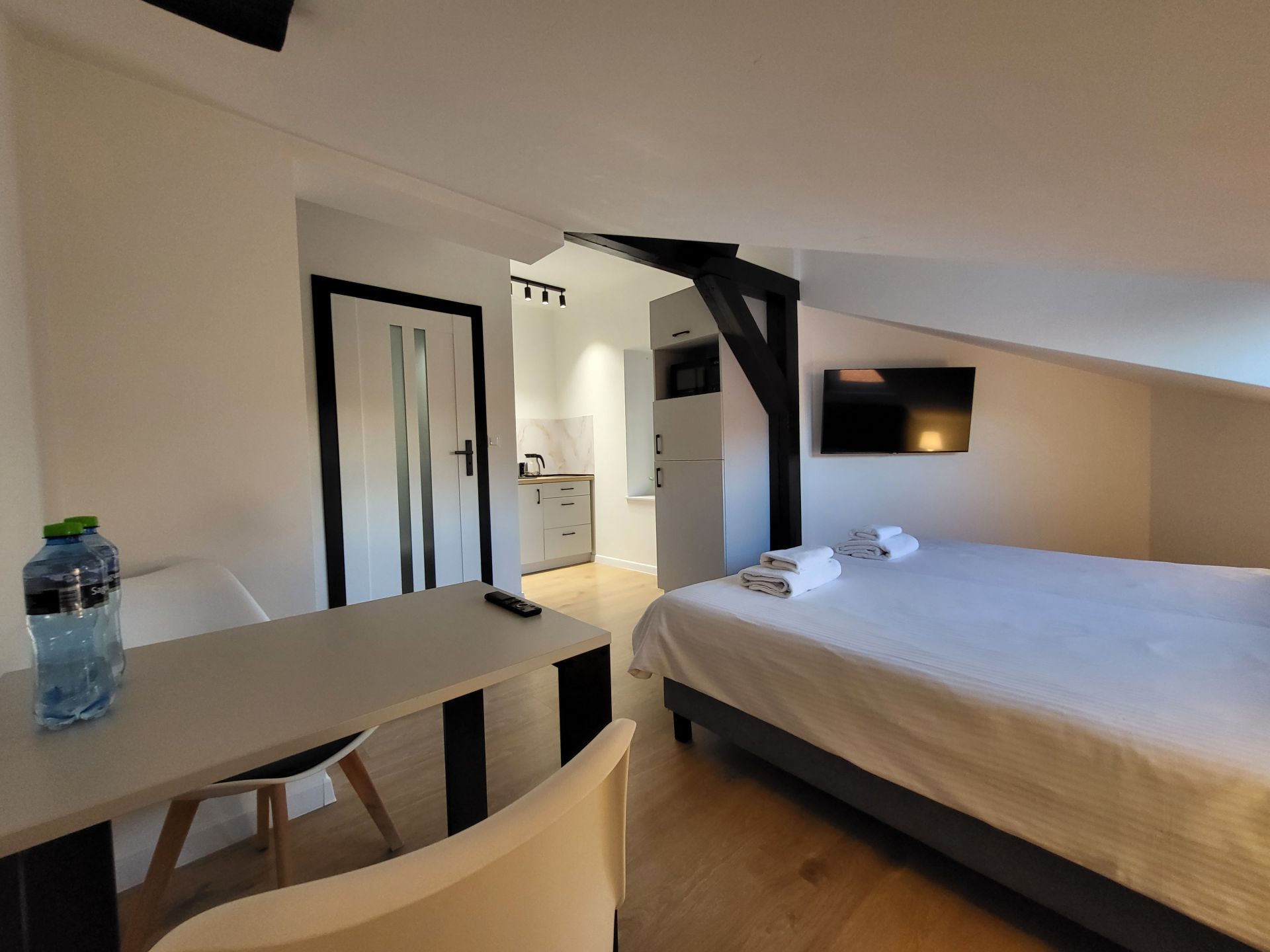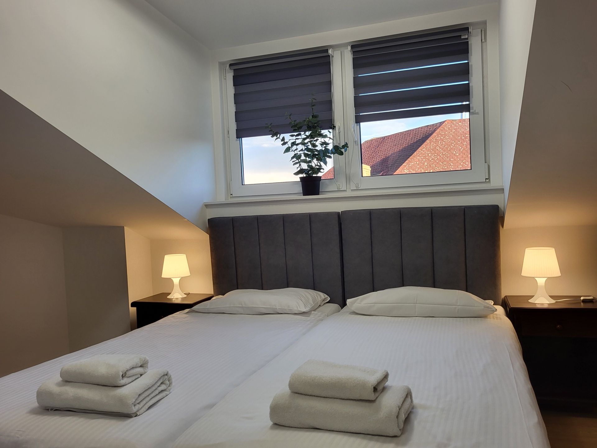 Apartament wyposażony jest w dwa łóżka pojedyncze zsunięte ze sobą, dzięki czemu idealnie sprawdza się zarówno dla par, jak i na pobyt jednoosobowy. Do dyspozycji Gości jest aneks kuchenny, telewizor oraz prywatna łazienka.