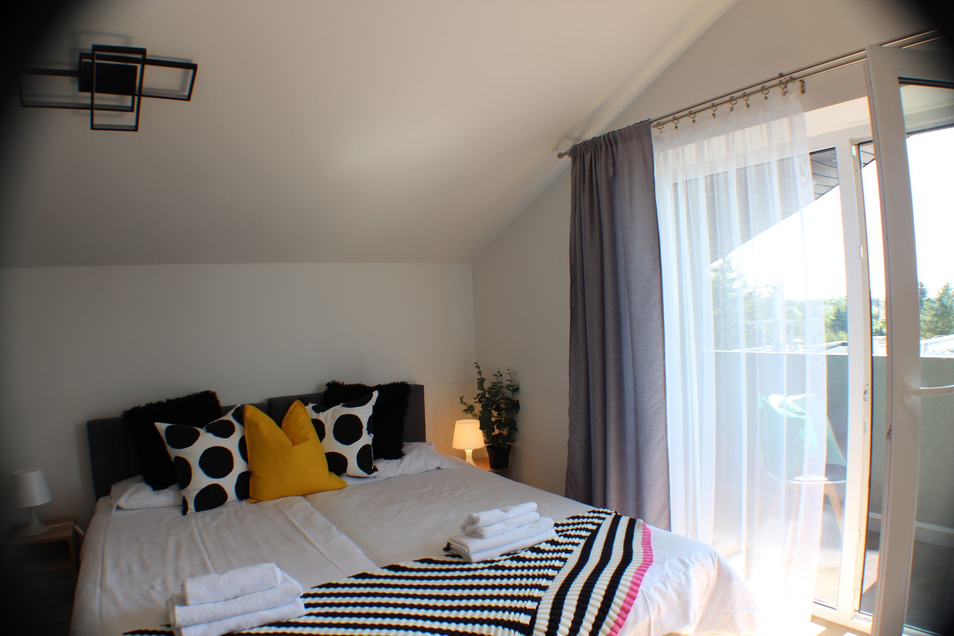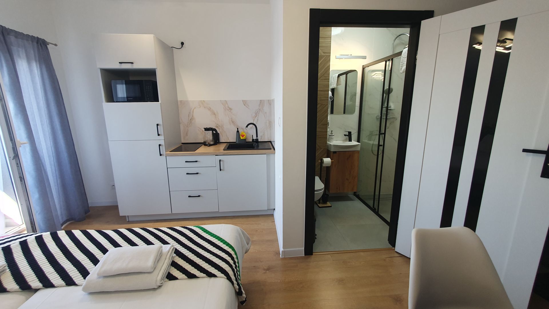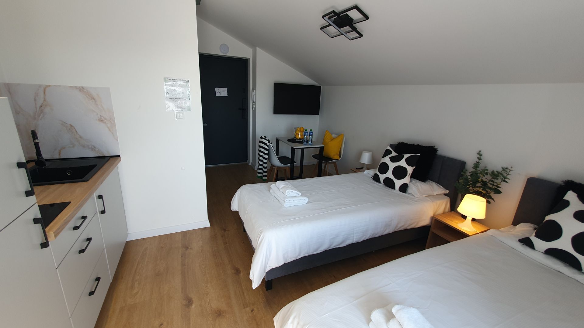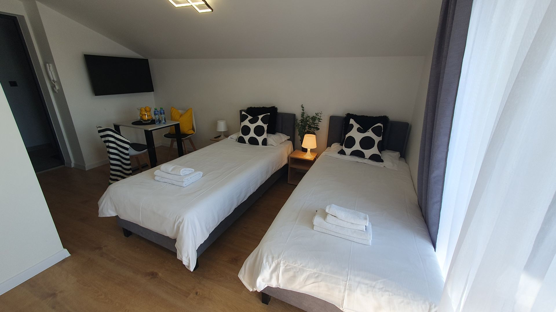Apartament wyposażony jest w dwa łóżka pojedyncze, które na życzenie Gości można połączyć, dzięki czemu idealnie sprawdza się na pobyt dla par jak i na pobyt jednoosobowy. W pokoju znajduje się balkon. Do dyspozycji Gości jest aneks kuchenny, telewizor oraz prywatna łazienka.