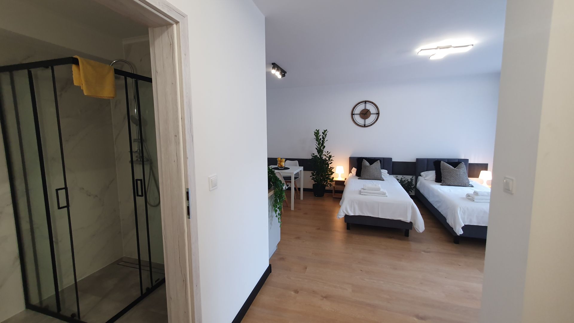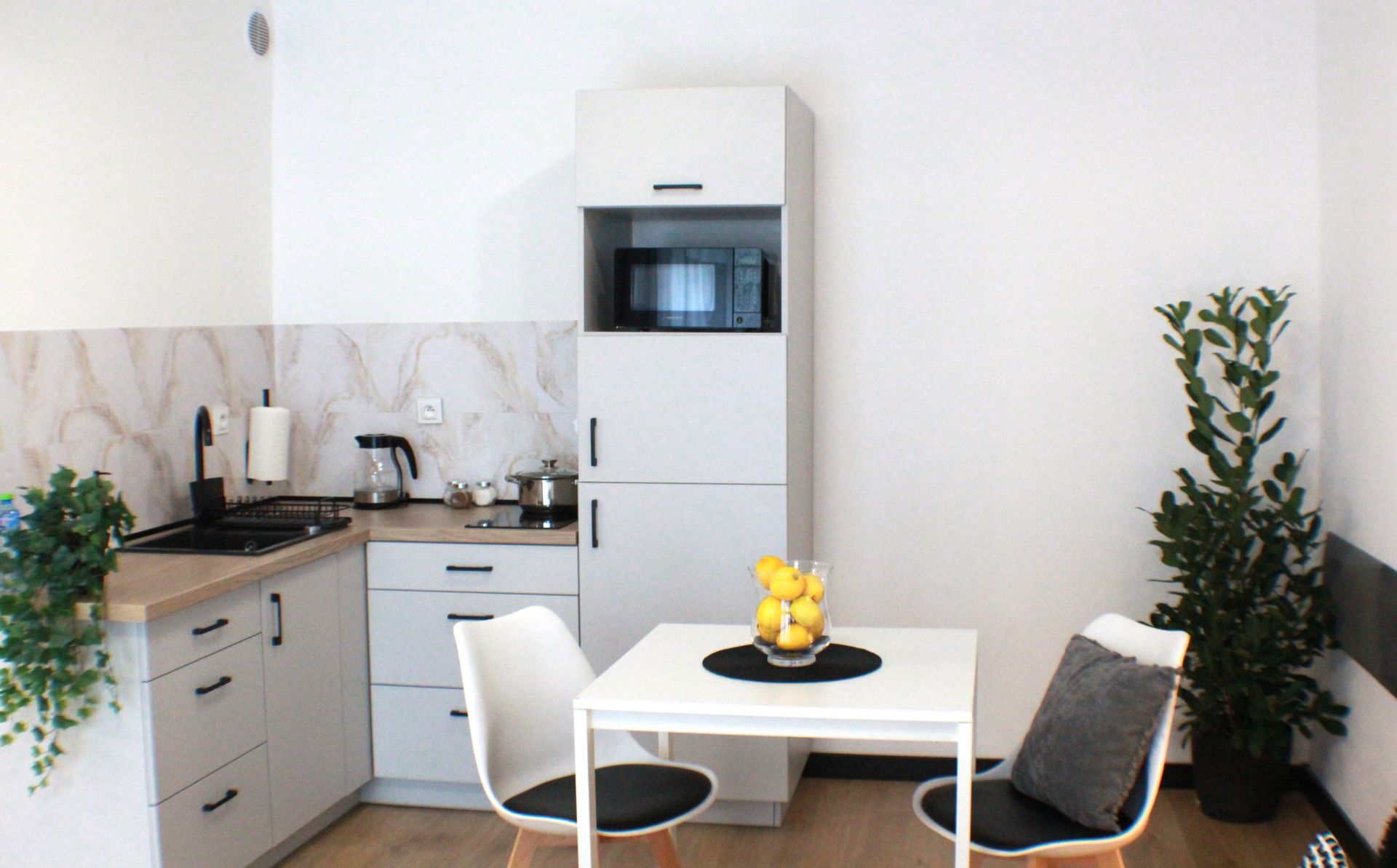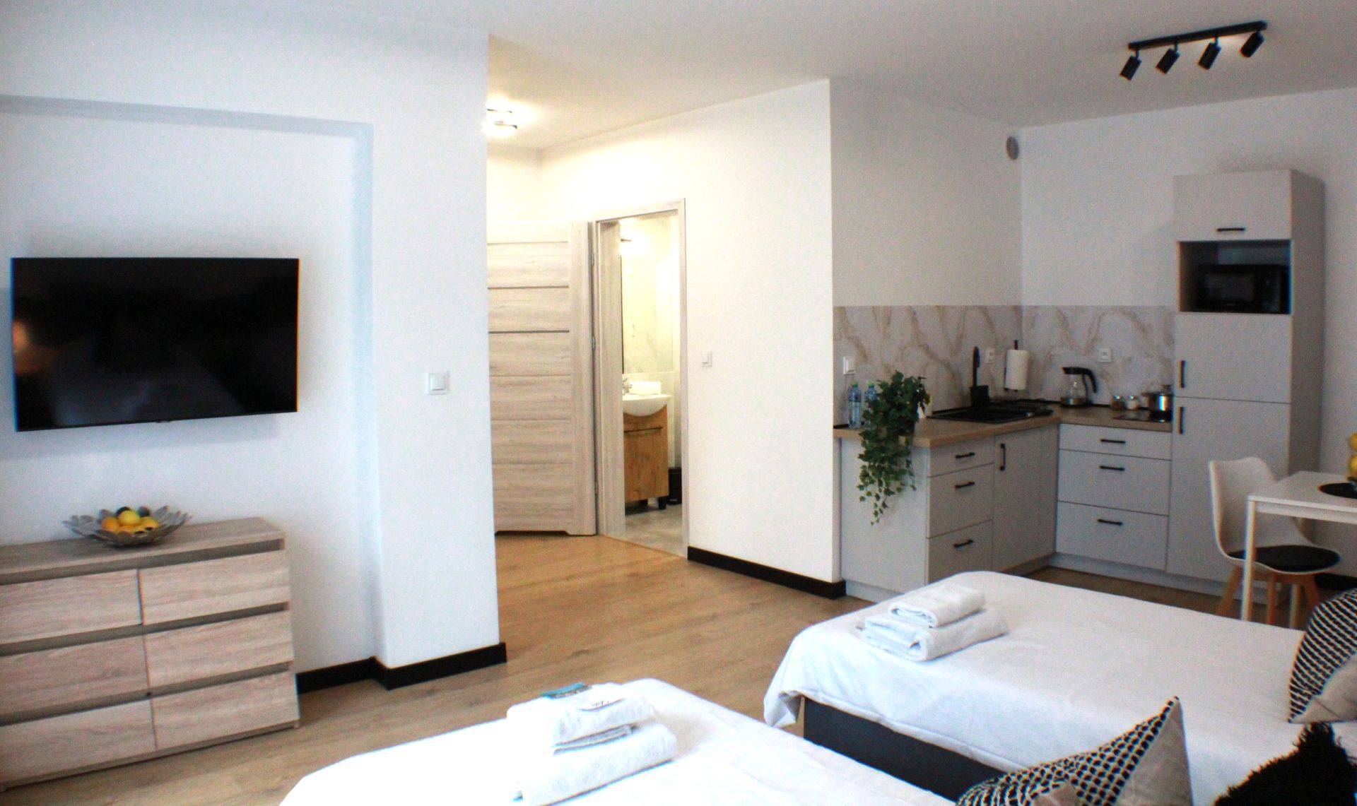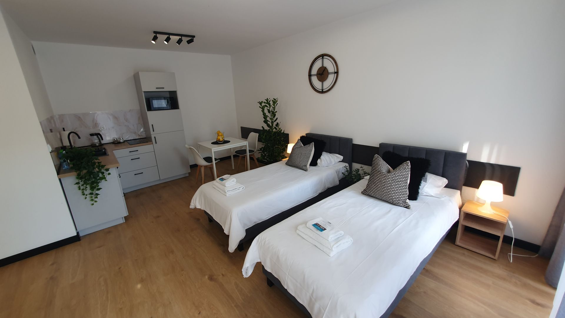 Apartament wyposażony jest w dwa łóżka pojedyncze z możliwością połączenia na życzenie Gości, aneks kuchenny z pełnym wyposażeniem do gotowania, telewizor oraz wyjście na taras. Do dyspozycji Gości jest prywatna łazienka.