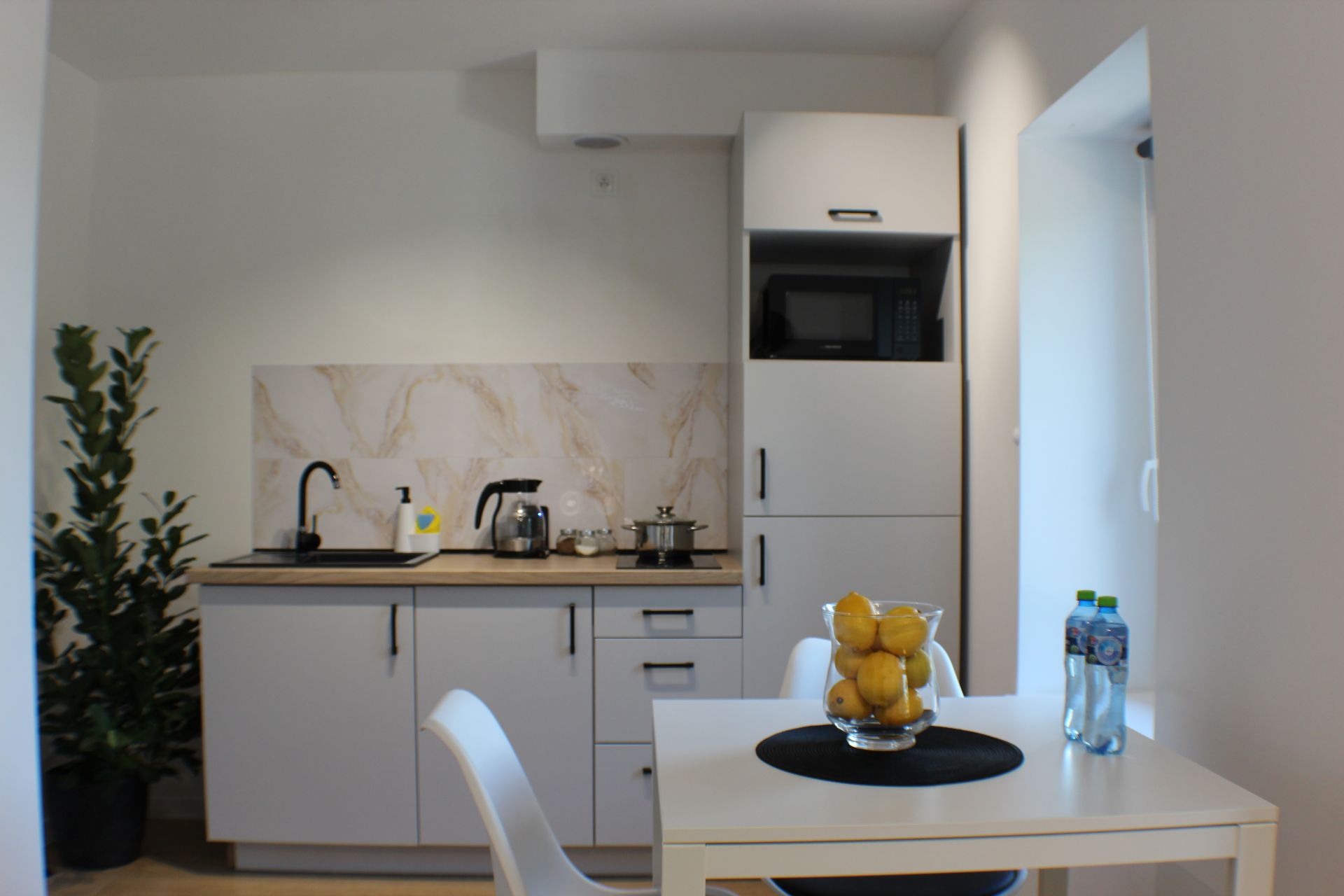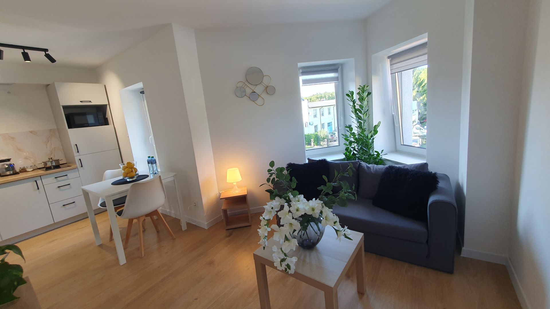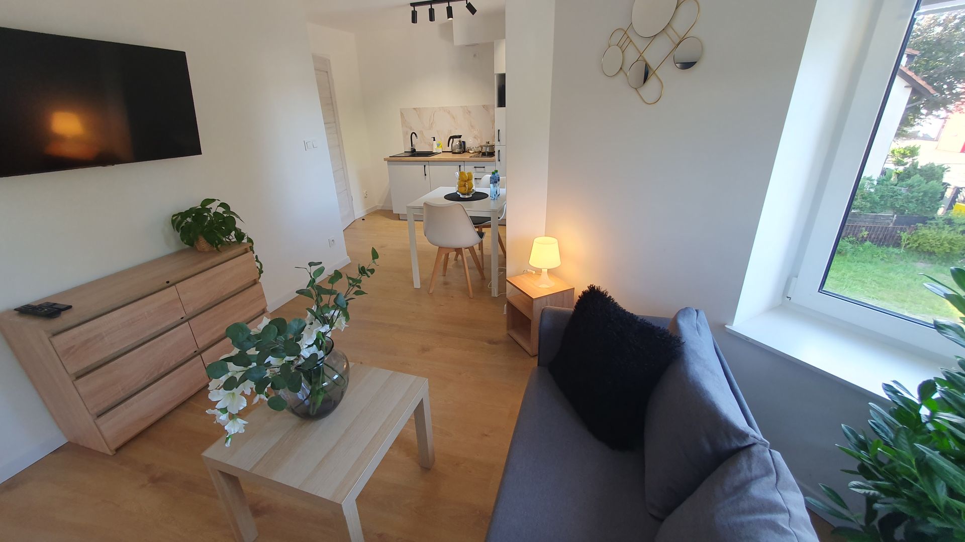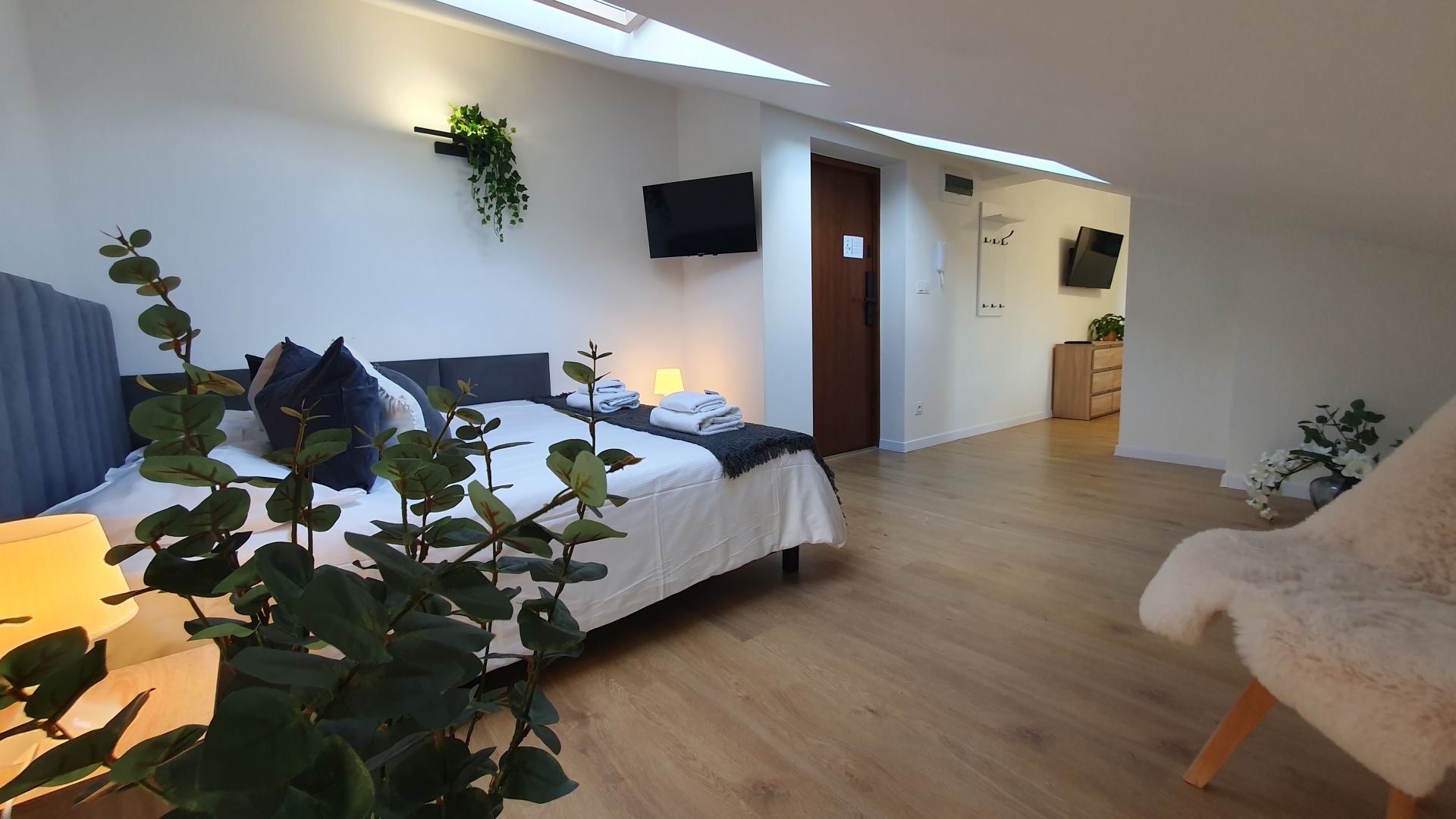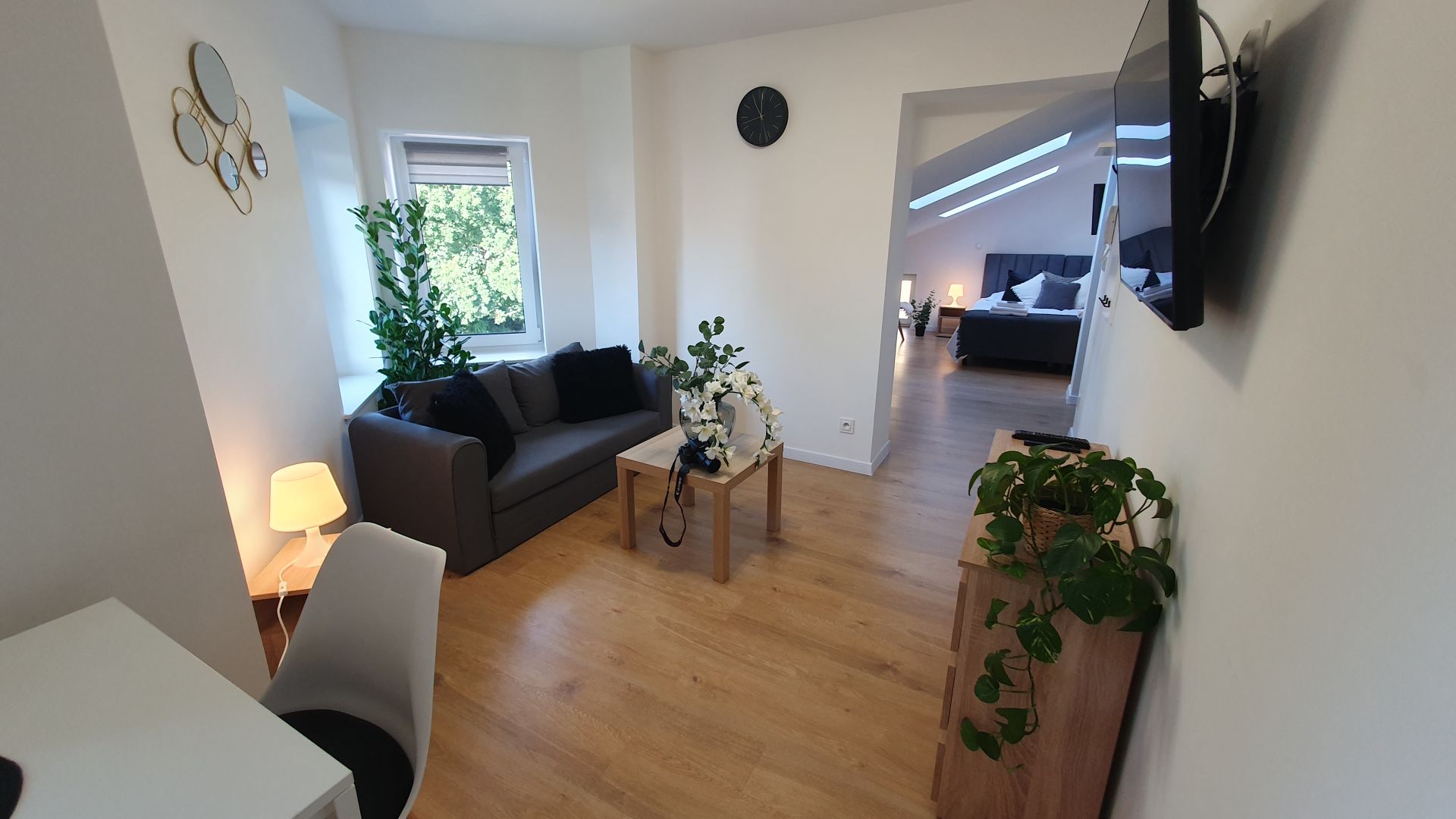 Apartament dwuosobowy z salonem. Apartament wyposażony jest w dwa łóżka pojedyncze z możliwością połączenia na życzenie Gości, salon z aneksem kuchennym z pełnym wyposażeniem do gotowania, telewizor. Do dyspozycji Gości jest prywatna łazienka.
