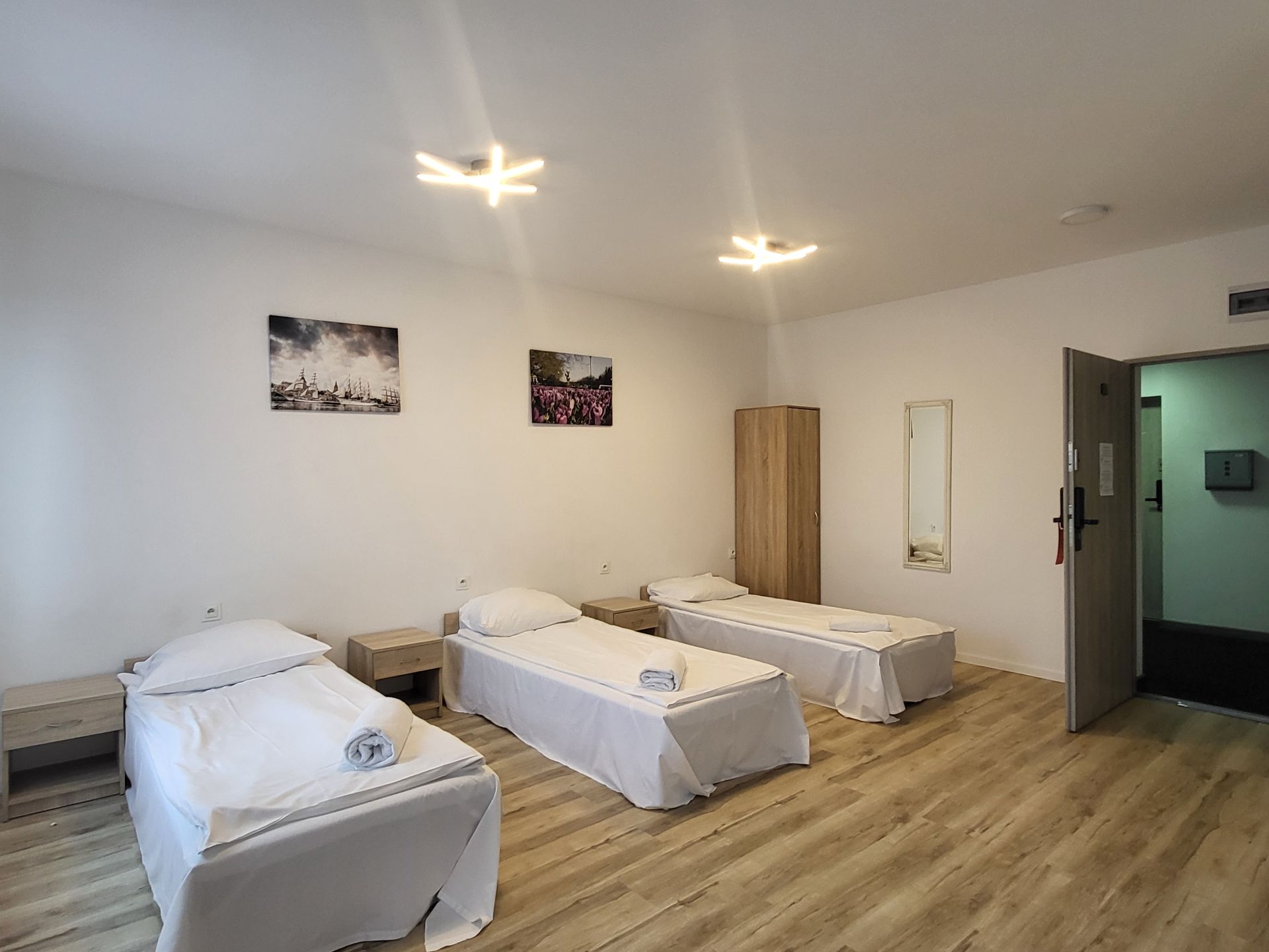 Pokój trzyosobowy. Pokój wyposażony jest w trzy łóżka pojedyncze, telewizor oraz aneks kuchenny z kuchenką mikrofalową. Do dyspozycji Gości jest prywatna łazienka.